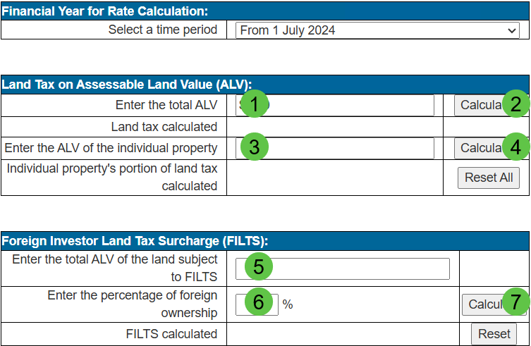 Estimate Land Tax and/or the Foreign Investor Land Tax Surcharge (FILTS).